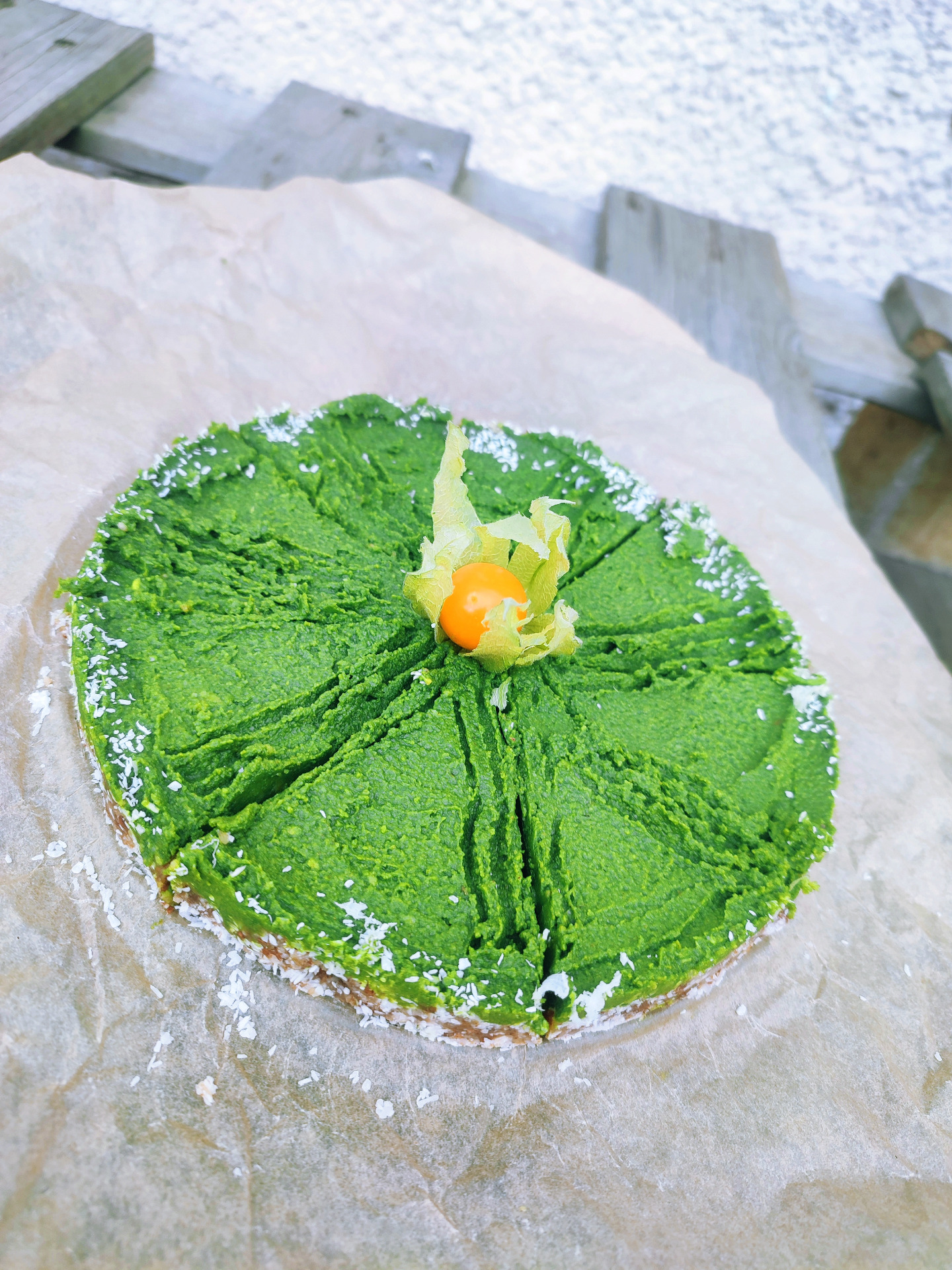 Korpus připravíme tak , že nameleme ořechy, kokos a datle nebo datlovou pastu. Utvoříme těsto, které natlačíme na papíru vymazaném kokosovým olejem do malé dortové formy. Necháme vychladit v lednici.